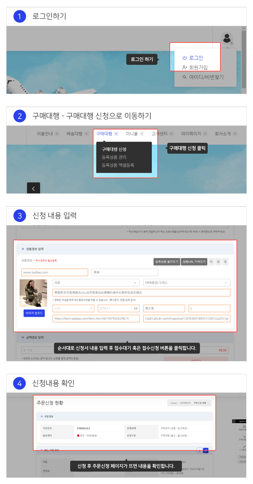 4) 상품가 결제가 완료되면 현지 쇼핑몰에 구매가 신청되며 신청이 완료 되면 주문번호가 배송이 시작되면 트래킹 번호가 노출 됩니다. * 구매 과정에서 쇼핑몰 재고가 소진 되었을 경우 결제 금액 전체를 환불해 드립니다.